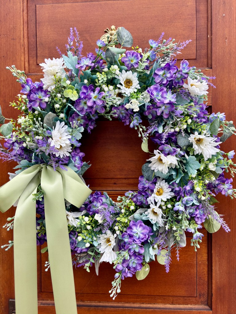 Layered purple blooms, soft lavender accents, white daisies, and airy greenery — full and abundant the way I imagined those flower beds would be. I added a sage green bow for that gentle cottage softness that always makes me think of countryside homes and open windows.
